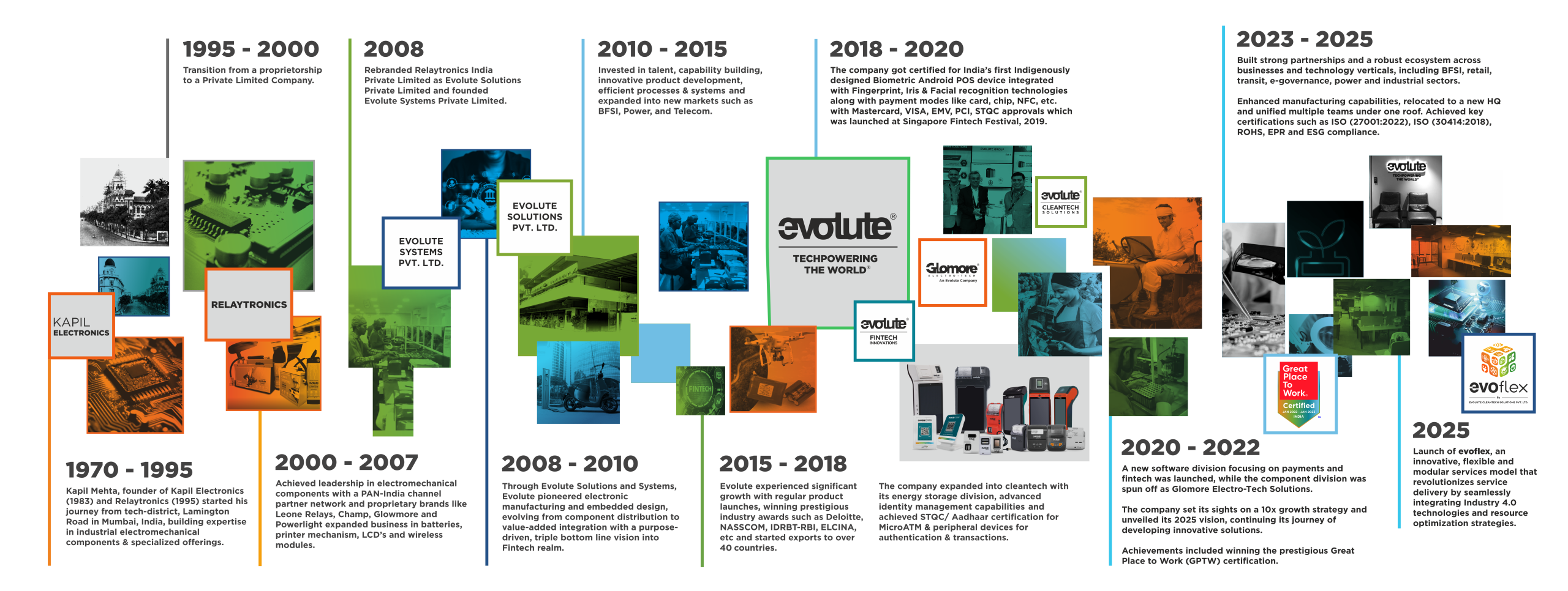 Evolute experienced significant growth with regular product launches, prestigious industry awards such as Deloitte, Nasscom, IDRBT-RBI, ELCINA, etc and exports to over 40 countries. The company expanded into cleantech with its energy storage division, advanced identity management capabilities, and achieved STQC/Aadhaar certification for MicroATM & Peripheral devices for authentication & transaction